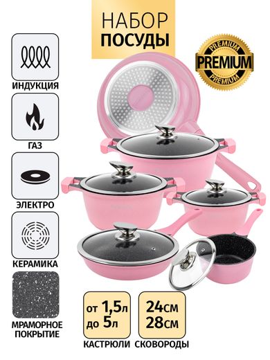 Набор кастрюль, сотейник и 2 сковороды Royalty Line (Pink)