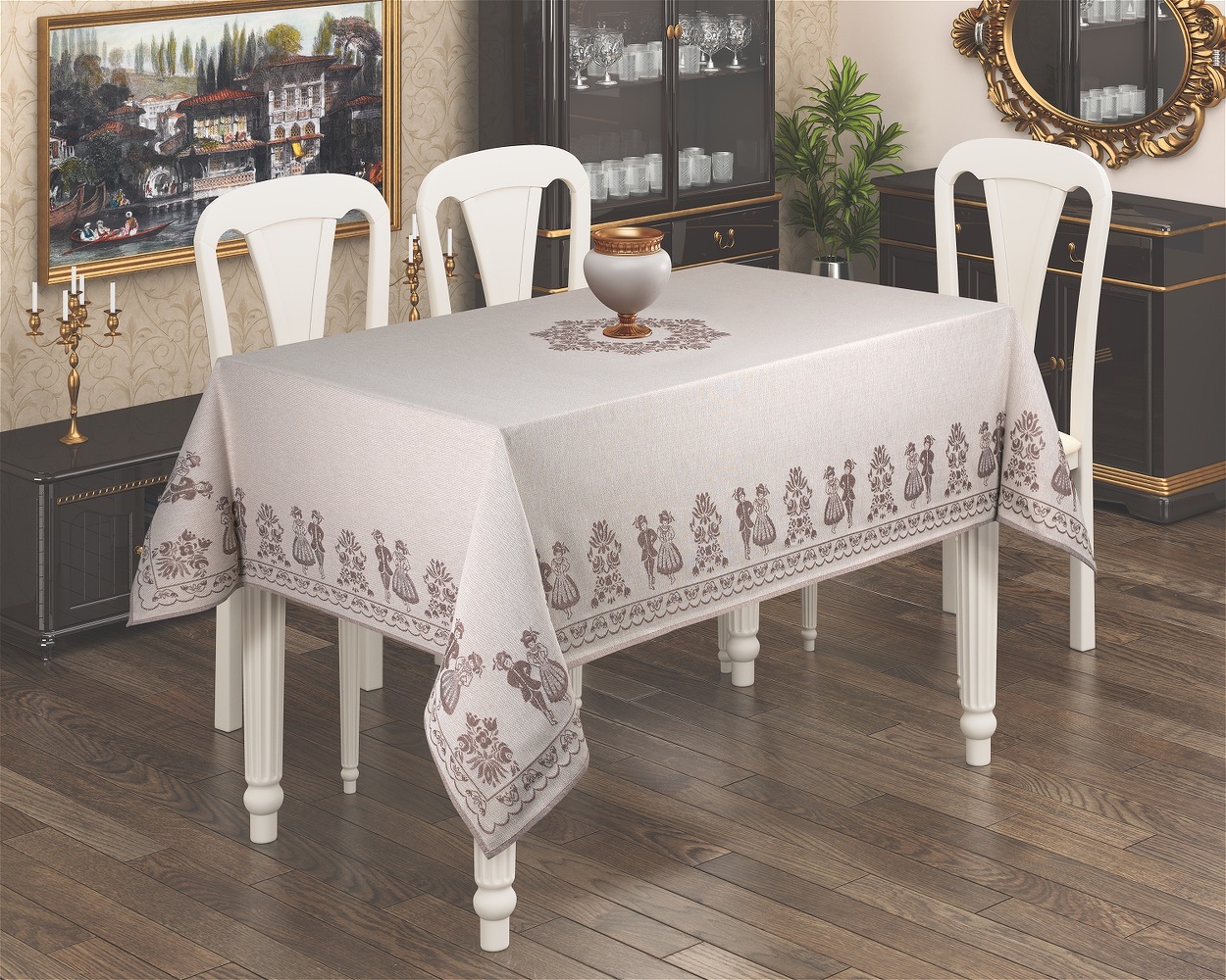 Скатерть изготовлена из 100% хлопка высокой плотности, выполнена с имитацией под гобелен, красивая декоративная окантовка по всему периметру изделия. Ткань неприхотливая в уходе, легко стирается и быстро сохнет.