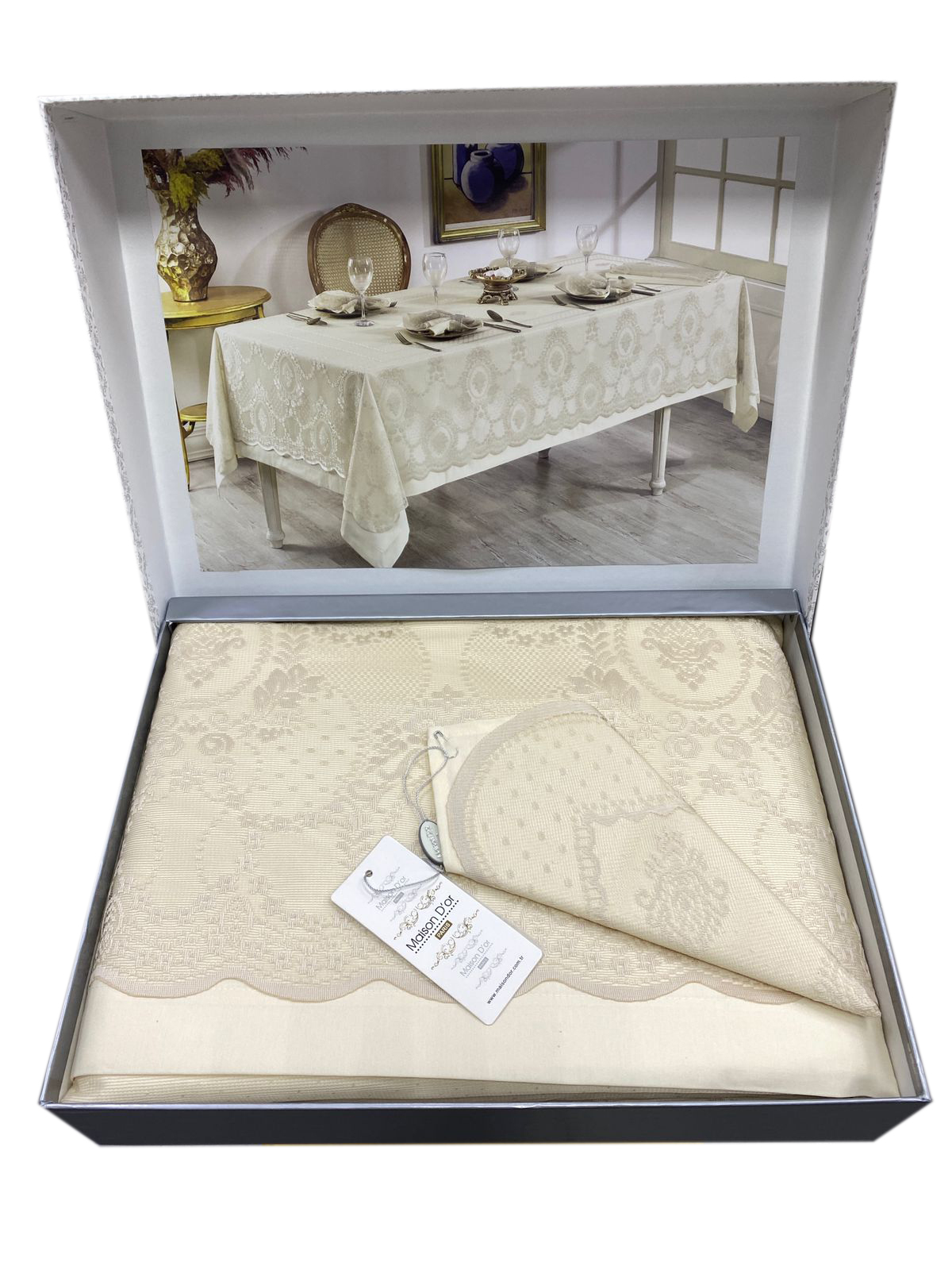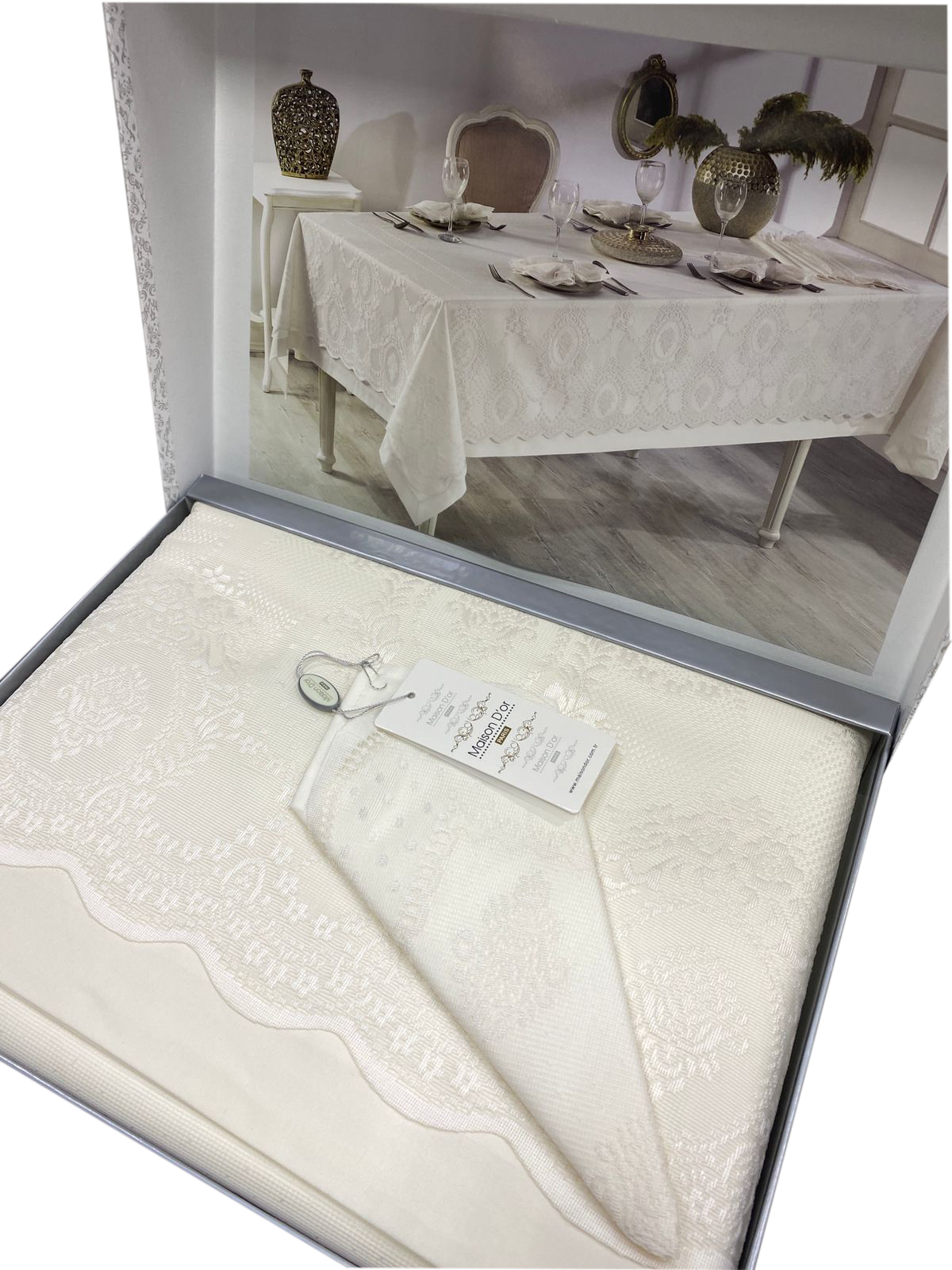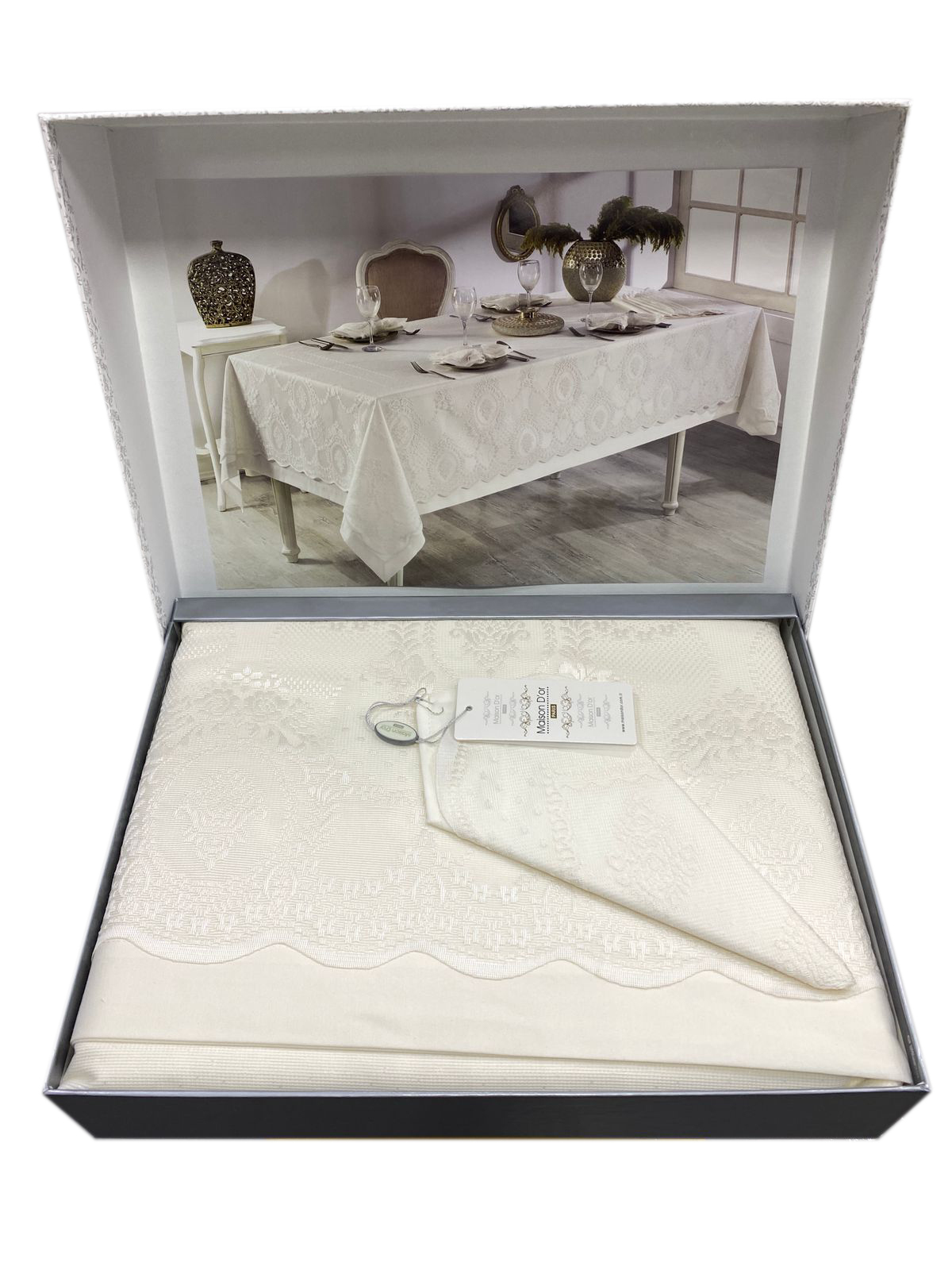 В комплекте со скатертью идут салфетки в том же дизайне и гипюровая накидка.