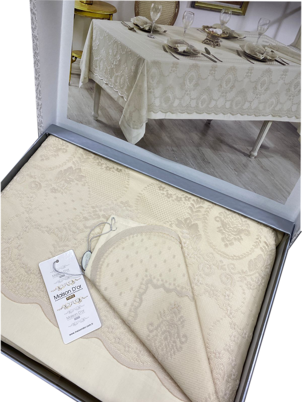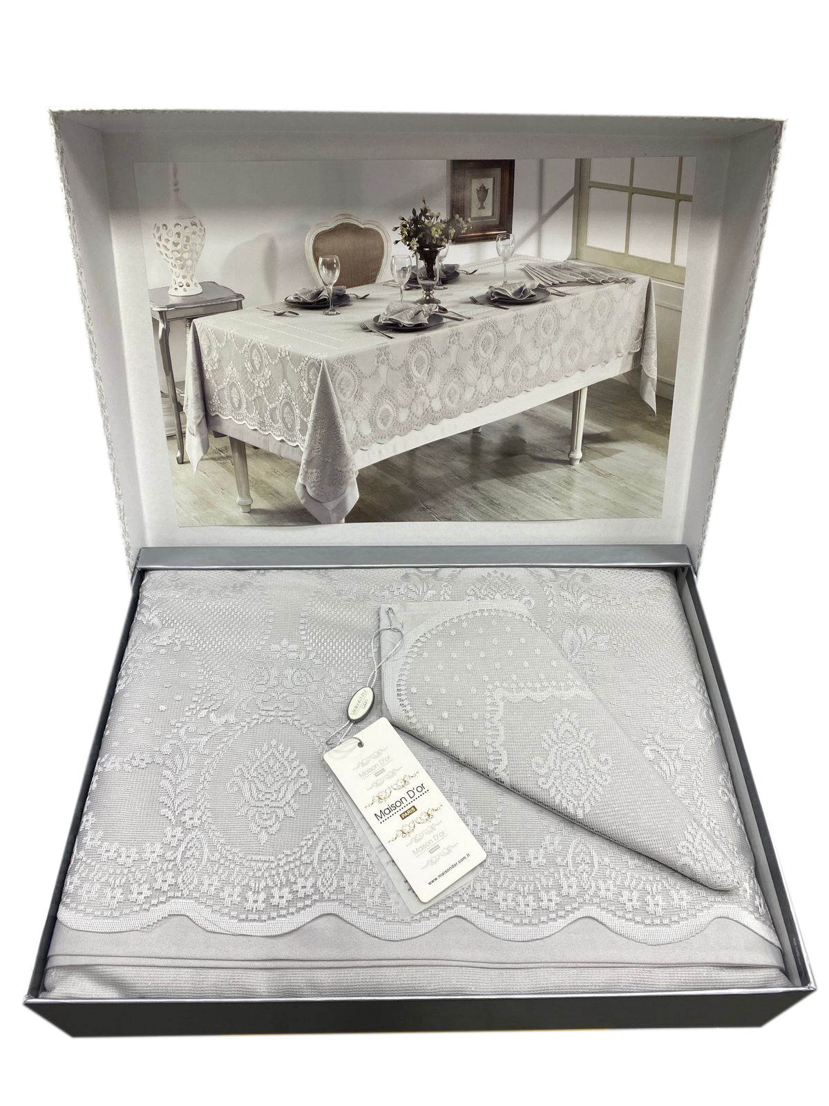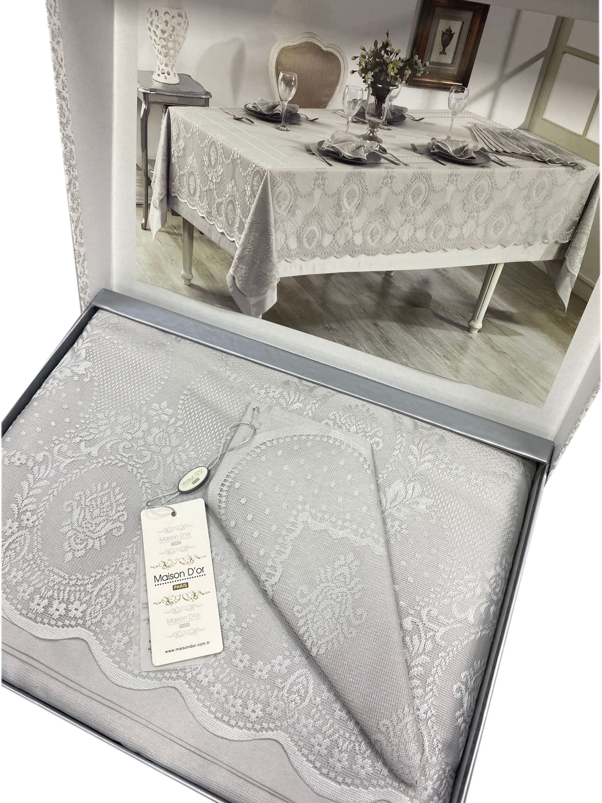 В комплекте со скатертью идут салфетки в том же дизайне и гипюровая накидка.