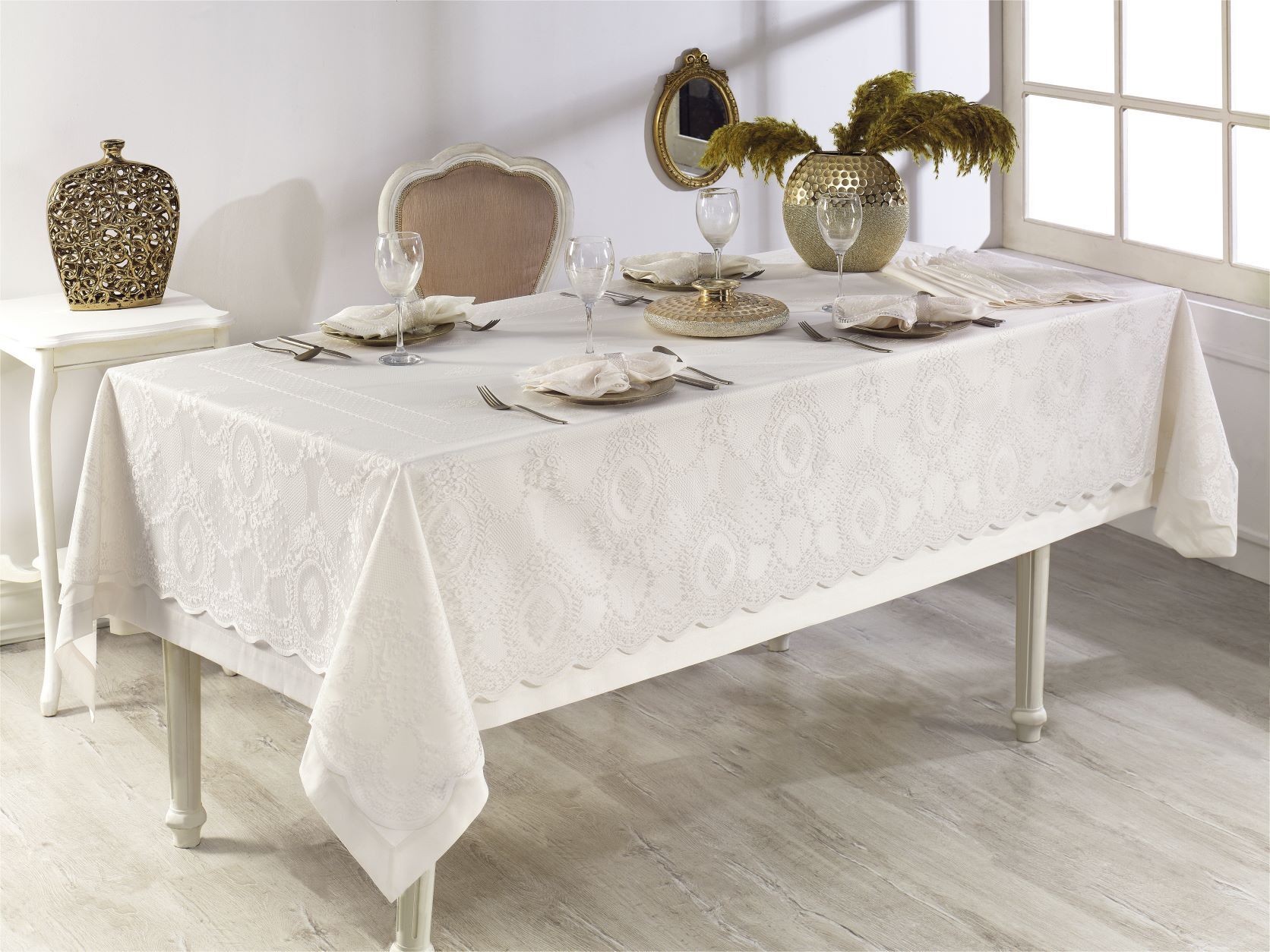 Красивая скатерть с салфетками MARINELLA от известного турецкого бренда Maison Dor, изготовленная смеси хлопка и полиэстра. Ткань неприхотливая в уходе, легко стирается и быстро сохнет.