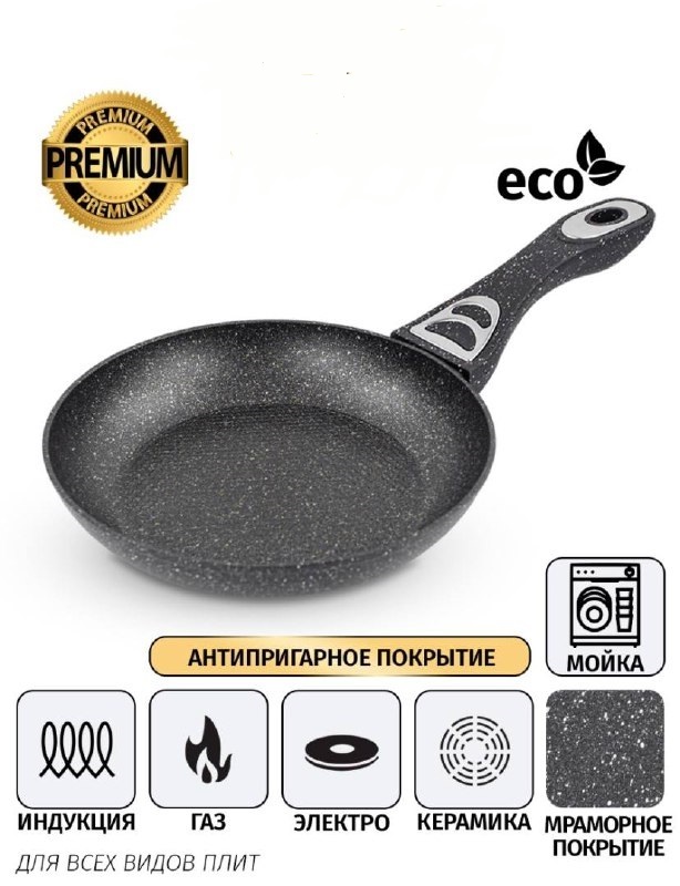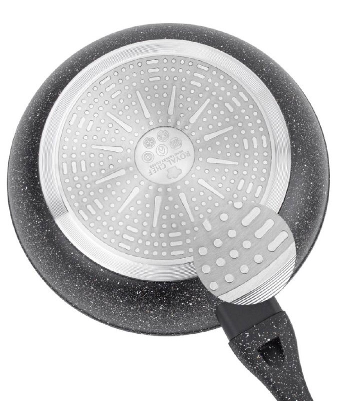 Сковорода с мраморной крошкой Royal Chef выполнена из качественного литого алюминия и снабжена антипригарным покрытием особой прочности. Покрытие антипригарное жаропрочное, защищает сковороду от царапин, является экологически чистым и полностью безопасным, без вредных соединений и примесей. За счет того, что пища не пригорает и не пристает к покрытию сковороды, ее легко и быстро мыть. Прочное индукционное дно сковороды устойчиво к повреждениям и деформации. Эргономичная ручка из бакелита не нагревается и не скользит. Такая сковорода является незаменимой для жарки и тушения различных блюд. Подходит для использования на всех типах плит. Подходит для мытья в посудомоечной машине.